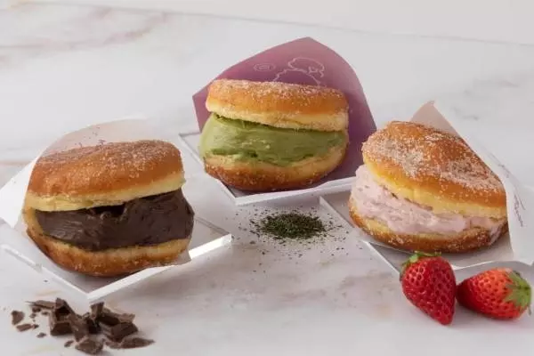 コエ ドーナツこだわりのふわふわ食感のイースト生地にサンドしたのは、舌にも、身体にも、心にも美味しいギルトフリーな本格派ジェラート。濃厚な味わいの「ヴィーガンチョコレート」、ストロベリーとはちみつが絶妙にマッチする「いちごミルク」、オーガニック緑茶をブレンドした大人な和ジェラート「宇治抹茶」の3種類のフレーバーが用意されている。