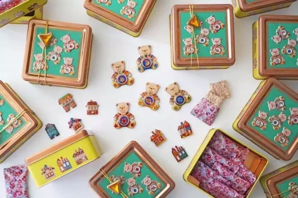 レトロな“ブローチ”をデザインした限定パッケージにも注目。ゴールド×グリーンやネイビーの缶に、“宇宙くま”や“世界の街並み”のブローチを描き、煌びやかなデザインに仕上げた。