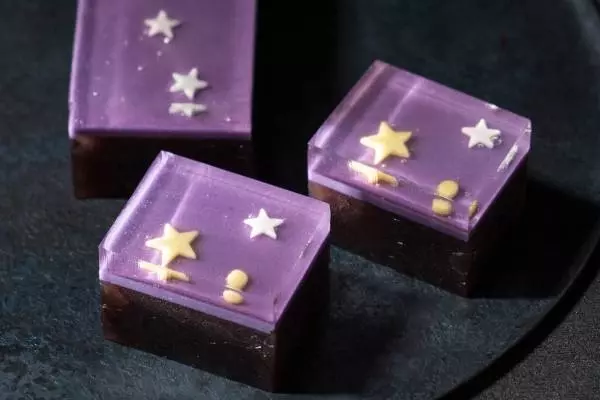 鶴屋吉信がおくる期間限定品は、“夏の夜に輝く星”を琥珀羹に閉じ込めた、ロマンティックな和スイーツだ。風味豊かな小倉羹と琥珀羹の2層仕立てになっており、透明感あふれる琥珀羹の中には、星型のパーツがあしらわれている。パッケージにも、天の川の箔押しを施し、スペシャルなデザインに。