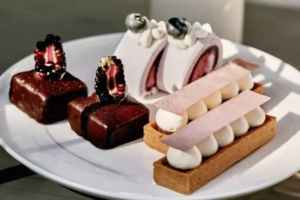 スイーツは、パティシエチームが手掛けるエレガントな6種類を用意。ラベンダーの爽やかな香りが口いっぱいに広がる「ラベンダーとレモングラスのマカロン」や、ブラックベリーの酸味をアクセントにしたケーキ「ブラックベリージャムのザッハトルテ」、アサイージュレを忍ばせたミックスベリーのムースなどを取り揃えた。