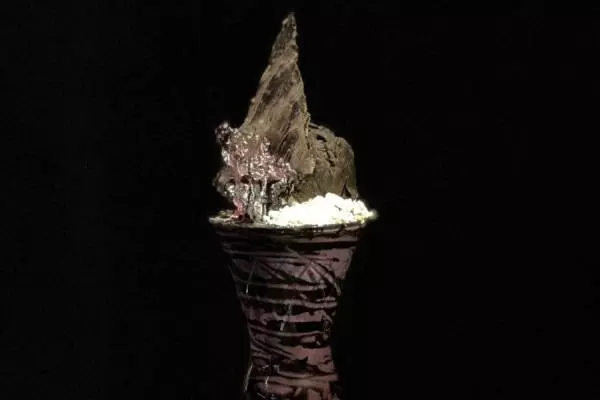 トップの“岩石風”トッピングは、ムースショコラ入りのブラッククレープ。横に添えたメレンゲと一緒に楽しむのがおすすめだ。またグラスの中には、ジューシーなアメリカンチェリーとマンゴーの果肉を重ねている。アートの様なビジュアルと、旬のフルーツの贅沢な味わいをぜひ堪能してみてはいかが。