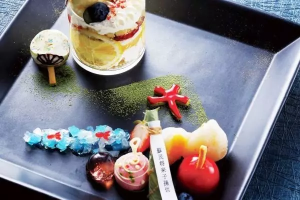 プレートに並ぶのは、ミニパフェや“団扇”型クッキー、“ヨーヨー”を模したイチゴのムースなど。特にミニパフェは、車輪に見立てたレモンスライスや桃のコンポート、ベリーのソースなどを重ね、その上に“山鉾の真木”のようなフロランタンをあしらった華やかな一品だ。