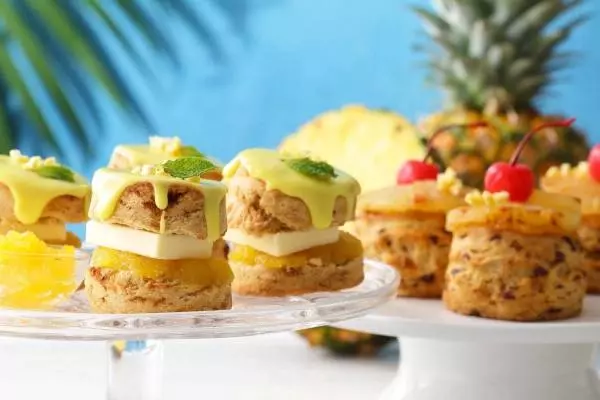 このほか、バナナとマカダミアナッツを加えたスコーンに、ジューシーで甘酸っぱいパイナップルとチェリーをトッピングした「パイナップル&マカダミアバナナスコーン」、アールグレイとオレンジピールが香る「紅茶&オレンジピールのスコーン」、爽快レモネードにたっぷりのパイナップル果肉を加えた「パイナップルレモネードスカッシュ」など、トロピカルなムードが漂うメニューの数々が展開される。