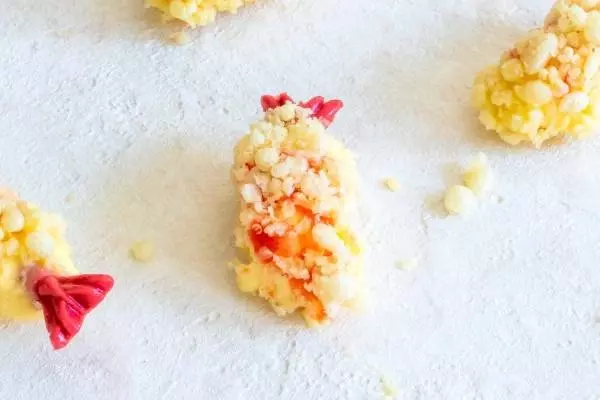 バニラ香るバタークリームと苺のコンフィチュールに飾ったのは、フランボワーズのバターチョコレートで作った“エビのしっぽ”。その上から、ベルギーの濃厚なバターチョコレートでコーティングし、さらにサクサクの衣をあしらった。ひと口食べると、サクサク&カリカリ食感の衣と、じゅわ~っと溶け出すとろとろのバターが豊かなハーモニーを奏で、夢見心地の食体験を提供する。
