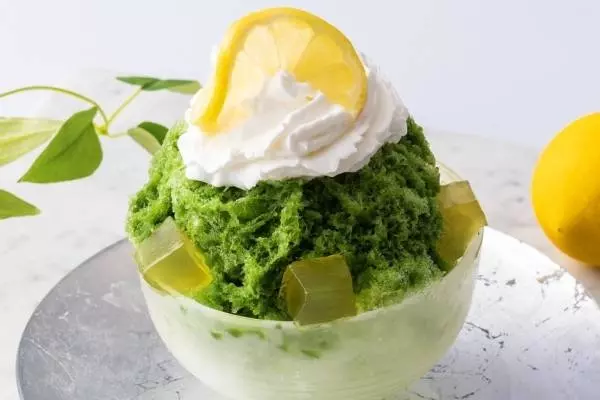 かき氷の主役となる「さわやか抹茶ぷりん 瀬戸内レモン」は、2層仕立ての抹茶プリン。隠し味にチーズを使用した抹茶ぷりんに、瀬戸内レモンストレート果汁を取り入れたレモンジュレ層を重ねて、さっぱりとした味わいに仕上げている。