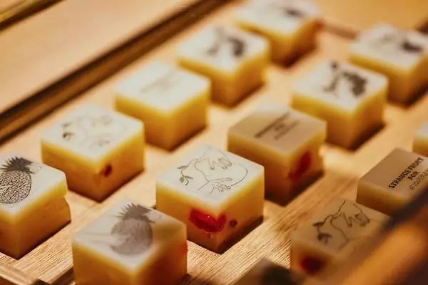 ジャズ歌手ビリー・ホリデイの楽曲「ストレンジ フルーツ(Strange fruit)」を着想源に、りんごをマイクにして歌う様子を捉えた「アップル シンガー(Apple singer)」など個性あふれる5種類のイラストを1棹の羊羹に描いた。