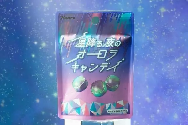カンロの新作は、“夜空にきらめくオーロラ”をカラーと味わいで表現した、ロマンティックなキャンディだ。パープル、ブルーグレー、イエローグリーンの3色をマーブル状に組み合わせることで、幻想的な光を放つオーロラを描き出した。
