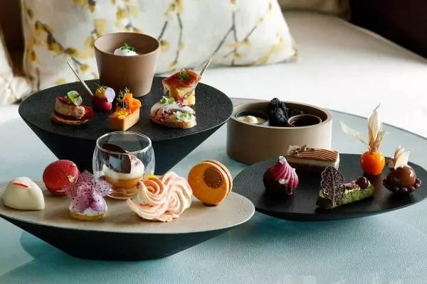 開業10周年を記念してリニューアルした本アフタヌーンティーは、石川県輪島市を拠点に世界的に活躍する輪島塗塗師・赤木明登の器で提供する、まるでアート作品のようなアフタヌーンティーだ。代表作である漆器「Stones」にホテルからのインスピレーションを織り交ぜたオリジナル作品をキャンバスに見立て、器にあわせてシェフが作り上げた芸術的なスイーツやセイボリーを提案する。