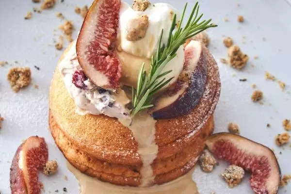 カフェ&ブックス ビブリオテークからいちじくの限定パンケーキ、ローズマリー香るミルクティーソースで