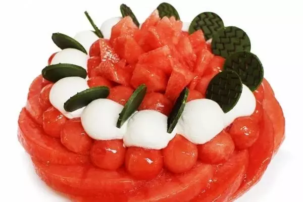 山形県尾花沢市産すいかと合わせたのは、カスタードクリームベースや抹茶ムース。濃厚でコクのあるカスタードクリームが、みずみずしく甘いすいかの味わいをより一層引き立てている。トップに色鮮やかなすいかを美しく並べ、見た目にも美しいビジュアルに仕上げた。
