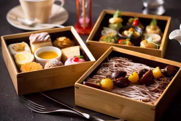 リーガロイヤルホテル京都、お重箱で楽しむ秋アフタヌーンティー - お重一面に敷き詰めたモンブランも