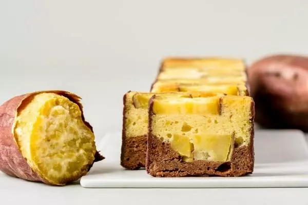 使用するさつまいもは、徳島県鳴⾨市の農園「⽊元農園」のなると金時を厳選。ほくほくとした⾷感と上品な⽢味が特徴のなると金時をガトーショコラの上部にたっぷりにあしらった。