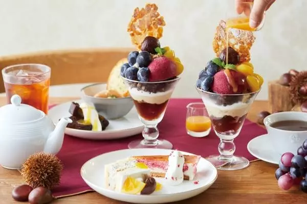 うれしいのは、「秋の贅沢ティーコース」でしか味わえないパフェ「渋皮栗とカシスのスペシャルパフェ」が付属すること。イタリア産の栗を使用したマロンクリームに、巨峰やほうじ茶ゼリー、カシスシャーベットなどを重ね、甘酸っぱいアプリコットソースを添えて提供する。