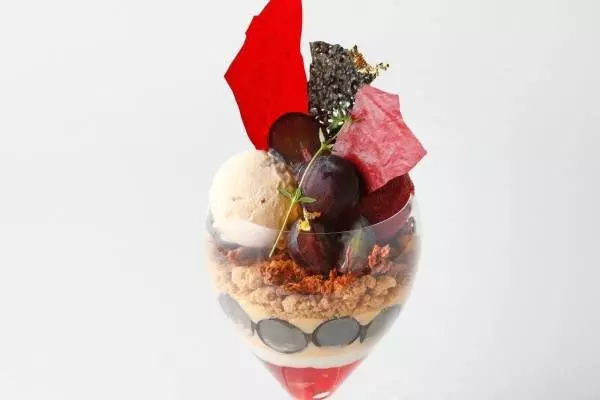 トップは、ウイスキー漬けレーズンをブレンドした濃厚なバニラジェラードとカシスソルベを盛り付け、さっぱりとした味わいに。その下には、フィアンティーヌチョコと塩味が効いたクランブルを敷きつめて、ザクザクとした食感をプラスした。さらに食べ進めると、ウイスキー風味のクリーム、フレッシュな巨峰、ウイスキー漬けレーズンが順々に現れる。