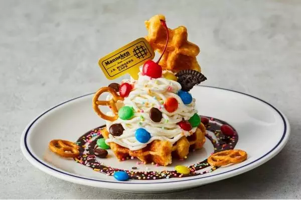 J.S. バーガーズ カフェで展開するスイーツの中で人気の“ワッフル”が、パワーアップ。コラボレーションでは、「マネケン」のワッフルを使用し、個性的に仕上げた2種類のワッフルデザートを展開する。