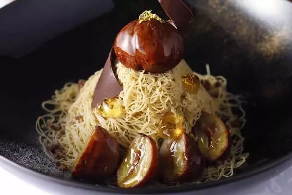 中でも特に注目したいのは、こっくりとした甘さを特徴とする京都府産の高級栗・丹波栗と青森県産のカシスを組み合わせた「お皿で楽しむ丹波栗のモンブランパフェ」。丹波栗のモンブランクリームの中に、丹波栗のアイスクリームや伝統のバニラアイスクリーム、カシスシャーベット、ミルクアイスなどを忍ばせ、アクセントにラム酒のゼリーを散りばめた、特別な皿盛りパフェだ。