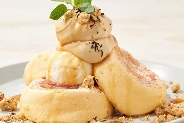 中でも特に注目したいのは、アッサム茶葉を使用したロイヤルミルクティークリームと、ほんのりとレモンを効かせた爽やかなレアチーズクリームを合わせた「奇跡のパンケーキ ロイヤルスイートミルクティー」。仕上げに、アールグレイを混ぜ込んだクランブルと自家製アールグレイシロップをかけていただく、紅茶の香り高い一皿となっている。