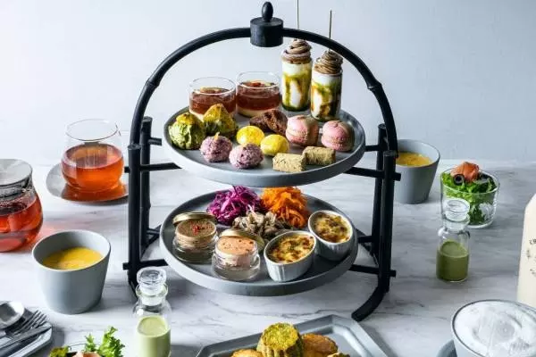 ティースタンドには、宇治抹茶とキャラメルソースを使ったモンブラン団子のベリーヌや炭火ほうじ茶のテリーヌショコラ、紫芋と柚子の黒米おはぎなど、お茶のエッセンスに和と洋をミックスさせたスイーツが勢揃い。