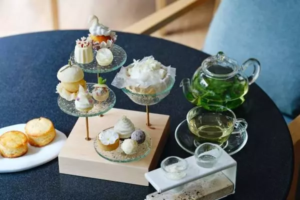 凍った湖を彷彿とさせるスタンドには、“白鳥”をあしらったカップケーキや、スノードーム型に仕立てた金木犀のジュレ×ババロアなどのスイーツ9種がラインナップ。さらに、帆立貝や百合根、ズワイ蟹をふんだんに用いたセイボリーや、焼き立てのスコーンが並ぶ。香り高いフレッシュハーブティーを含むオリジナルティーセレクションと共に楽しんで。