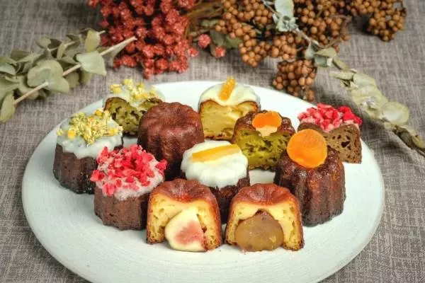 「ジャスミンとエルダーフラワーの半熟カヌレ」は、生地にジャスミンの茶葉を使用して焼き上げ、エルダーフラワーのソースとカモミールをトッピングした上品な香りと華やかな見た目が特徴的。