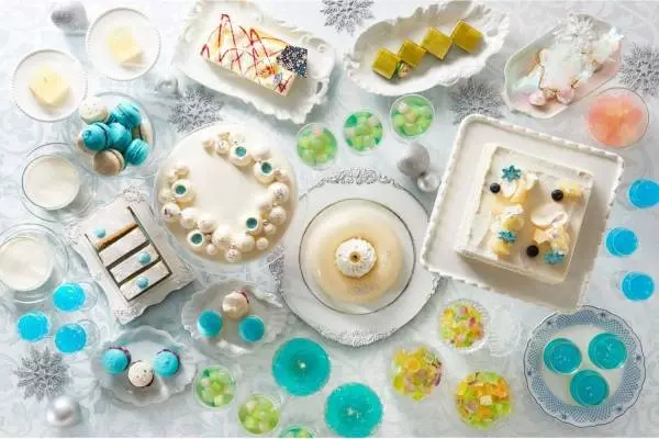 「ウインタースイーツビュッフェ ~ Snow Fantasy ~」では、幻想的な白銀の雪景色や、シルバーやブルーの宝石などをイメージした、煌びやかな全26種のスイーツがラインナップする。