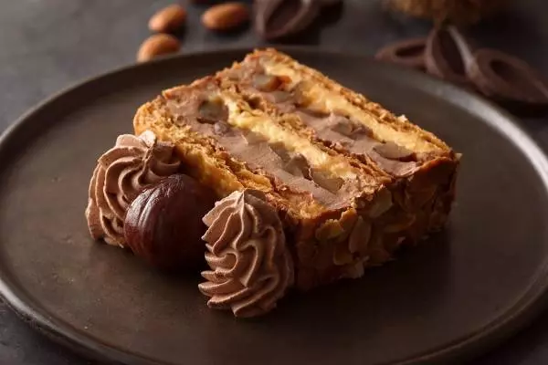香ばしいサクサク食感のパイとなめらかなショコラクリームが、ほくほく甘い栗の風味を際立たせている。冬にぴったりの、リッチな味わいを楽しめる1品だ。