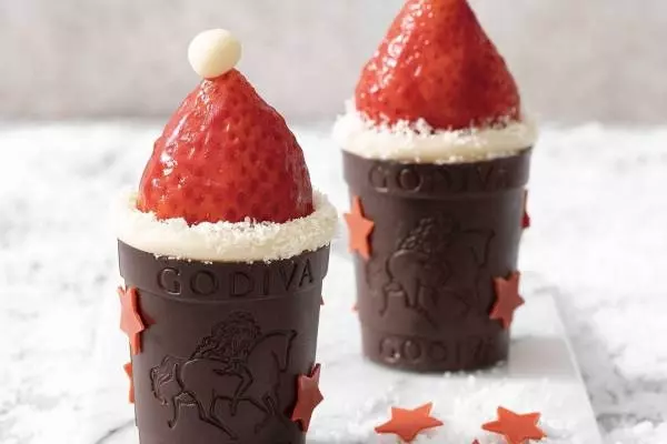 たとえば「クープショコラ サンタクロースの帽子」は、アトリエ ドゥ ゴディバの人気スイーツ「クープショコラ」のクリスマスバージョン。スポンジ、ホイップクリーム、角切り苺を層に重ねたチョコレートカップに苺を丸ごとトッピングした、ショートケーキのような味わいが楽しめる一品だ。
