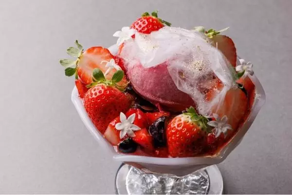 「苺 MOCHI パフェ」は、“苺大福”をイメージした華やかなパフェ。下から順に、バター香るクランブル、大納言小豆と柔らかな求肥ロールを重ね、ラズベリーとブルーベリーの濃厚なソースを流し込んだ。トップには、スミレ香る濃厚なベリオレットのソルベとともに、甘みと酸味のバランスが絶妙なとちおとめを贅沢にトッピング。仕上げに、繊細な綿飴のレースを纏わせた。