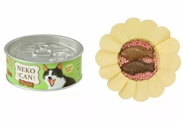 メリーチョコレートの「ねこみゃみれ」は、“猫好き”にはたまらない、猫モチーフのチョコレートを展開する新ブランド。豊富なラインナップの中でも注目は、“猫缶”をイメージしたユニークなチョコレートだ。缶の蓋まで忠実に再現したパッケージの中に、2種類の魚型チョコレートなどを詰め込んだ。