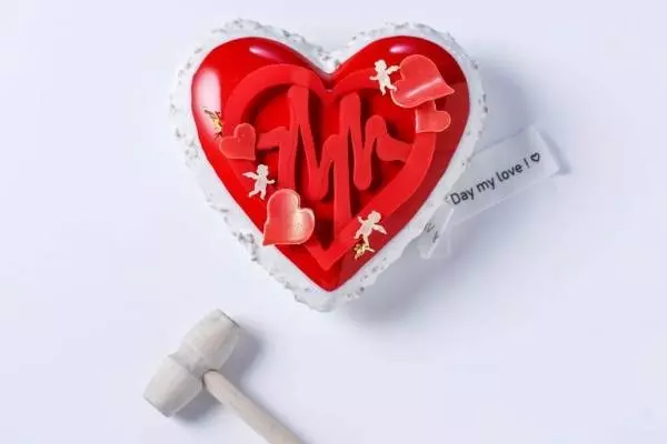 心臓の鼓動を描いたポップなデザインと、その周りで飛ぶキューピットが印象的なハート型スイーツ「ハートビート」。鮮やかな真紅で、表面は艶めきを放っている。そんな「ハートビート」の大きな特徴は、付属の木製ミニハンマーでスイーツを叩き割ると、ヘーゼルナッツやメープルピーカンナッツ、ピスタチオ、パールチョコレートなどが溢れ出てくること。