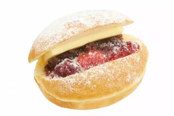 もう1つの新作「苺&小倉あんバター」は、北海道十勝産小豆を使用した小倉餡と、北海道産バターを挟んだ“あんバタードーナツ”。