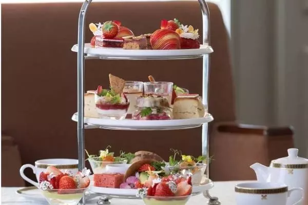 本館17階「インペリアルラウンジ アクア」で楽しめるのは、華やかなレッドカラーで彩られた「アフタヌーンティー フレーズ(Fraise)」。ティースタンドには、オペラ座のステージをイメージし、ビスキュイと苺のコンフィチュール、バタークリームを交互に重ねた“オペラ ルージュ”や苺のシュークリームなどのスイーツ、苺とヴィーガンマヨネーズをかけて楽しむ「ヴィーガンブーケサラダ」、苺のフォカッチャなどのセイボリーが並ぶ。