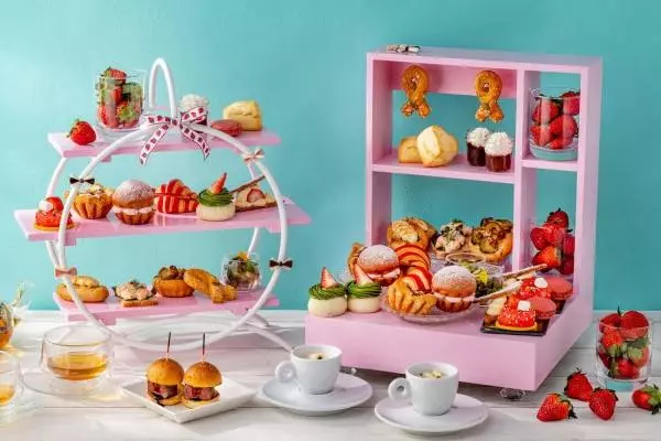 ヒルトン東京の「『いちごオ・レ』プティ・ブーランジェリー」は、パンと共にフレッシュな苺を楽しむことができるアフタヌーンティー。淡いピンクを基調にしたスタンドには、こだわりのパンやサンド、セイボリーが並ぶほか、フレッシュな苺を楽しむことができる。