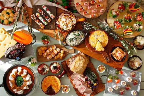 ブッフェ台を彩るのは、様々な手法でチーズの美味しさを引き出したメニューの数々。チーズをたっぷりと使用したラザニアやシーフードとチーズのアヒージョ、厚切りベーコンとラクレットチーズのガレット、チーズケースで仕上げる焼きリゾットなど、多彩なメニューを通して世界のチーズを楽しめる。