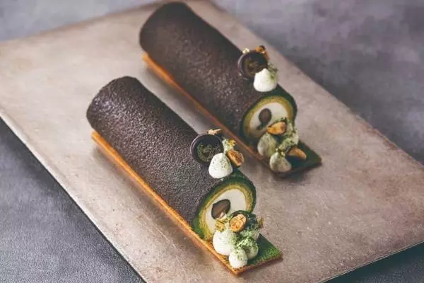 表面にはビターチョコレートを吹きかけることで、海苔巻きのような見た目に。上品ですっきりとした甘さの和三盆クリームと、濃厚な丹波黒豆、香り高い抹茶のビスキュイの組み合わせが口の中で豊かなハーモニーを奏でる。
