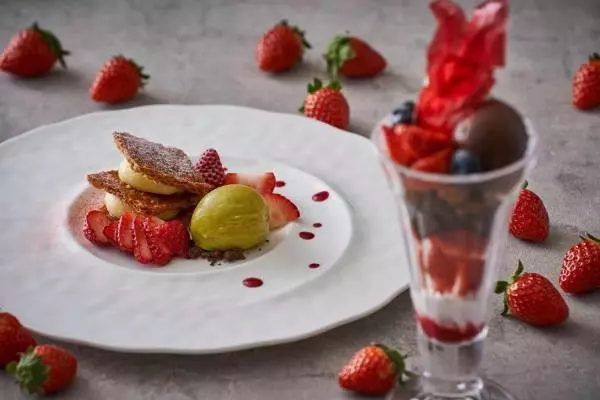 「いちごのミルフィーユ」は、提供前に仕上げるサクサクのパイに挟んだカスタード、フレッシュないちご、そしてピスタチオアイスが織りなすハーモニーが楽しめる一品。一方、生クリームやブラウニー、チョコレートアイスなどを重ねた「いちごのパフェ」には、甘酸っぱいいちごソースとフレッシュな果実を合わせている。