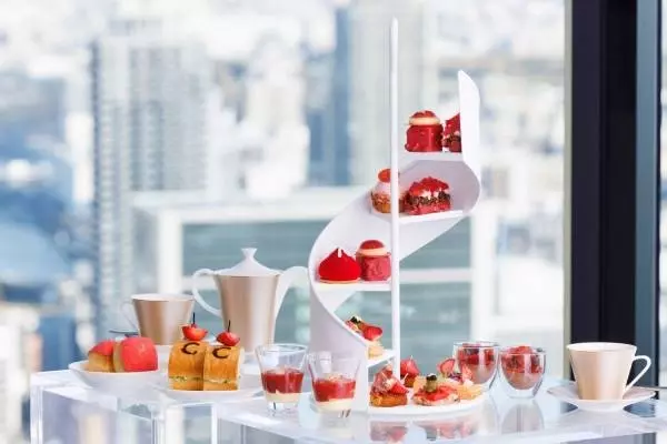 地上200メートルからの景色とともに、優雅なひと時を過ごせるコンラッド大阪のアフタヌーンティー。新たに提供される『「ショコラ・フレーズ」ストロベリーアフタヌーンティー』では、甘酸っぱい苺とチョコのマリアージュを楽しめる、多彩なスイーツが並ぶ。
