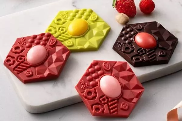 フレーバーは、いちご香るピンクルビーのボンボンショコラがトップに輝く「ラズベリー味」、濃厚に香るカカオと甘酸っぱいラズベリーがとろけ合う「スイート味」、そしてピスタチオのショコラにイエロートパーズのボンボンショコラを合わせた「ピスタチオ味」の3種類が楽しめる。