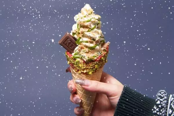味わいは、ピスタチオがメイン。クラッシュしたピスタチオ&ストロベリーチョコレートでコーティングした特製コーンに、バニラアイス・ピスタチオ・ライスパフをミックスしたシリアルアイスクリームを贅沢にのせた。赤や緑、シルバーのトッピングが楽しい、クリスマスムード高まる1品だ。