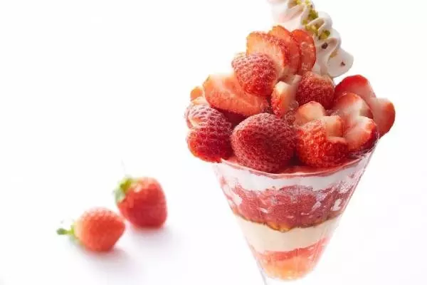 季節毎に変わる旬のフルーツをあしらったパフェは「苺のパフェ」が登場。支店5店舗では、苺の甘酸っぱさを感じられる苺りんごグラニデに、ホイップとマスカルポーネ苺ソースを合わせた。さらに、ザクっとした抹茶クッキーがトッピングされており、ほのかな苦味のアクセントを楽しめる。