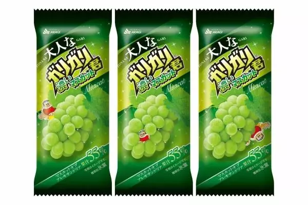 「大人なガリガリ君濃いマスカット」には、「マスカットオブアレキサンドリア」の果汁を55%使用。ベースとなるマスカットアイスの中に、ジューシーなマスカットかき氷を入れ、マスカット尽くしのリッチなアイスキャンディーに仕上げている。