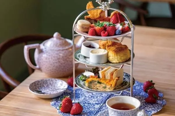 紅茶&スコーン専門店「ティールーム キキ」からは、英国の詩人・デザイナーのウィリアム・モリスが手掛けたテキスタイル「いちご泥棒」にオマージュを捧ぐアフタヌーンティーセットが登場。和歌山県直送のブランドいちご「まりひめ」を使った様々なスイーツと共に、優雅なティータイムが楽しめる。