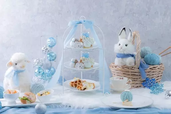 純白の細かな雪が降り積もる様子を彷彿とさせるハイティースタンドには、雪山で遊ぶひつじ型のマシュマロクッキーや“うさぎ”モチーフのマドレーヌ、“雪だるま”モンブランなどがラインナップ。さらに、爽やかなマスカルポーネチーズが主役のムースや、さっぱりとした白ワインジュレなどが展開される。