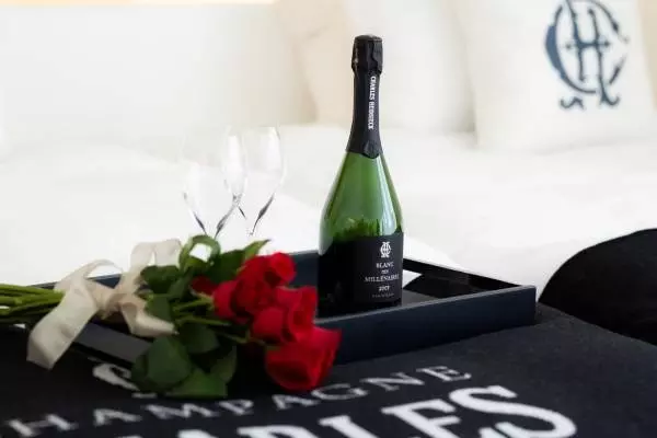 ボランジェルームでは「ラ・グラン・ダネ 2014」、シャルル・エドシックルームでは「ブラン・デ・ミレネール2007」など、全ての客室に、それぞれのメゾンが選定した特別なシャンパーニュ1本を用意している。