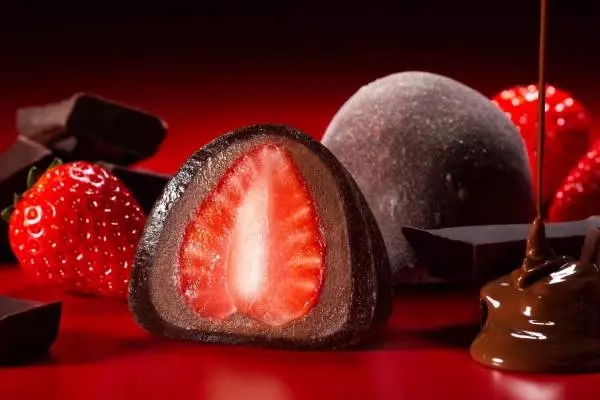 高級カカオペーストを加えたビターショコラ餅で包み込んだのは、フランス産ショコラを使用した餡と、高い糖度と適度な酸味が特徴の「とちおとめ」。甘酸っぱいいちごがコク深いショコラの味わいを引き立てる、バレンタインシーズンにふさわしいフルーツ大福となっている。