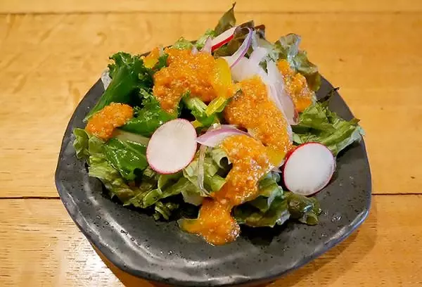まずいただいたのは、野菜とフルーツのパワーサラダ。一見レタスやカブ入りのただのサラダ……と思いきや、味わってびっくり。人参などの香味野菜と納豆を合わせたドレッシングが使われていて、野菜のジューシーで爽やかな甘さと共に、納豆の旨味がしっかりと主張してきます。