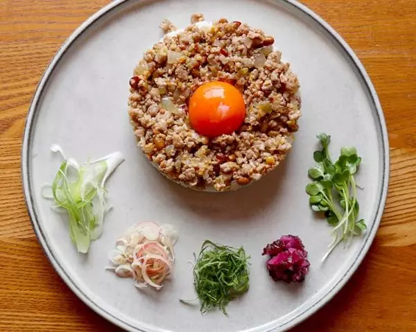 味付けは、粗びき豚と玉ねぎをオリーブオイル、ニンニク、鷹の爪で炒め、醤油や砂糖で和風に。火を止めてから納豆を混ぜ合わせ、味の濃い「濃紅」という卵の黄身を落としてご飯にトッピング。そこに店主が厳選した薬味が添えられています。