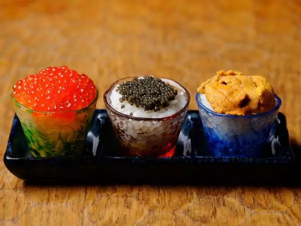 料理は高級食材でも出し惜しみなく提供。いくら・ウニ・キャビアが3個セットになった、『ミニミニおちょこ丼』など、少量の料理を日本酒に応じて楽しめるのが魅力です。