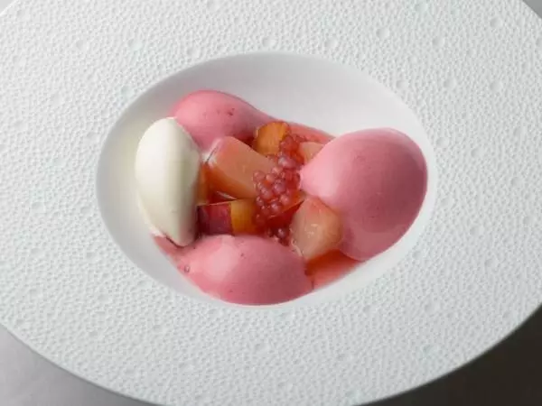 梨とコーヒー豆の風味を仲良く重ねた一皿は、夏〜初秋のデセール。コーヒー豆シロップに梨を漬けてからつくる梨のゼリー、梨のマリネが圧巻です。季節食材と独創的なアレンジで魅せるコースは、特別な日を祝うシーンにおすすめ。