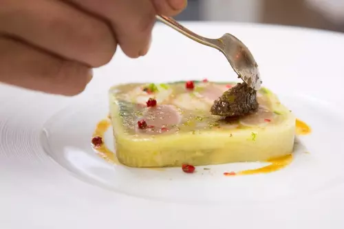 フランス料理の粋とシェフのこだわりを凝縮したスペシャリテを味わえる【レザン ファン ギャテ】。シェフのイマジネーションあふれる美しいテリーヌは、どれもそれぞれの素材感が立ちつつも一体感も感じられる逸品ばかりです。ぜひ目と舌でその感動を味わってみてください。